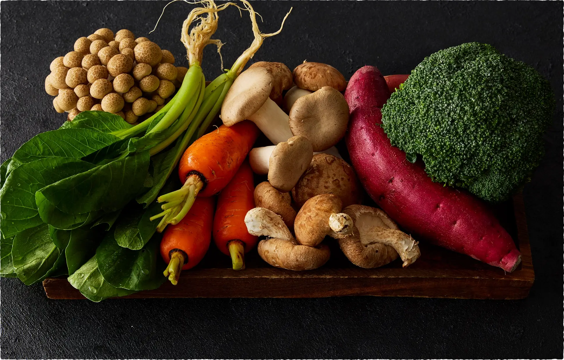 無農薬のさつまいも、きのこ、人参、小松菜、ブロッコリーなど、体に負担の少ない野菜を厳選。豊富に含む食物繊維やファイトケミカルが、愛犬の腸内環境をサポートします。